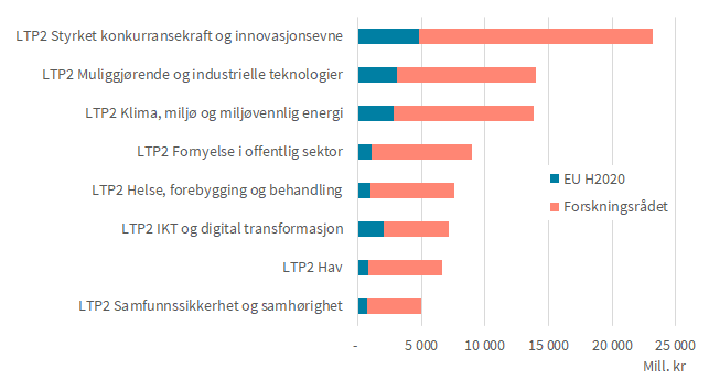 Figur 4.b viser hvordan de prioriterte områdene i Langtidsplan for forskning og høyere utdanning 2019–2028 finansieres fra både Forskningsrådet og EUs 7. rammeprogram og Horisont 2020. Høyest er andelen innenfor IKT og digital transformasjon, innenfor muliggjørende teknologier, styrket konkurransekraft og innovasjonsevne og klima, miljø og miljøvennlig energi. Det ser dermed ut til at det i økende grad er et samspill mellom EU og Forskningsrådet når det gjelder finansiering, men det er variasjoner mellom de ulike områdene. Forskningsrådets porteføljestyrer har i sitt mandat ansvar for å se det nasjonale i sammenheng med det internasjonale når de vedtar porteføljeplaner og investeringsplaner. Videre har Forskningsrådet tilpasset sine søknadstyper og vurderingskriterier opp mot dem som gjelder for rammeprogrammet. Den nasjonale konkurransearenaen skal dermed virke kvalifiserende for den europeiske konkurransearenaen.
