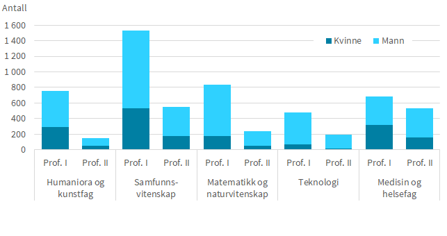 Professor II-stillingen er kjent som den minst likestilte stillingen ved universiteter og høgskoler. I 2019 var 33 prosent av professor I kvinner, mens kvinneandelen blant professor II var 27 prosent. Det er store forskjeller mellom fagområdene. Lavest andel kvinnelige professorer blant professor I finner vi innenfor teknologi med 14 prosent. Når det gjelder professor II innenfor teknologi, var kun 8 prosent kvinner i 2019. Motsatt hadde medisin og helsefag den høyeste kvinneandelen blant professor I, 46 prosent, mens professor II kun hadde 27 prosent kvinner. Her er det imidlertid store forskjeller mellom medisin på den ene siden og helsefag på den andre siden. Nær 70 prosent av professor II-stillingene var innenfor basal-medisin og klinisk medisin i 2019. Her var kvinneandelen 23 prosent. For professor II-stillinger i helsefag var kvinneandelen 49 prosent.