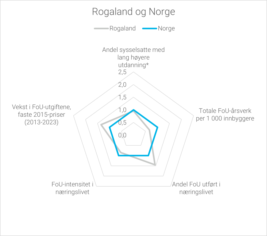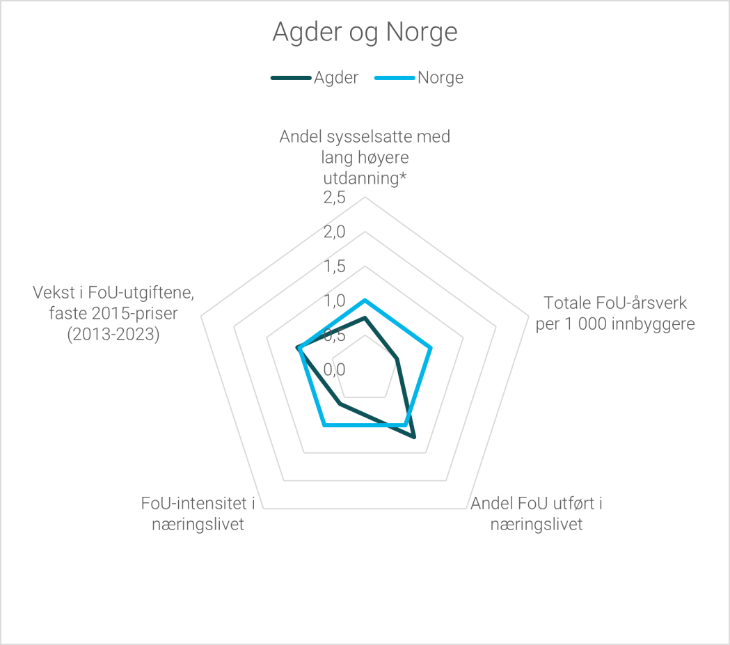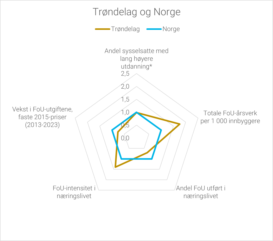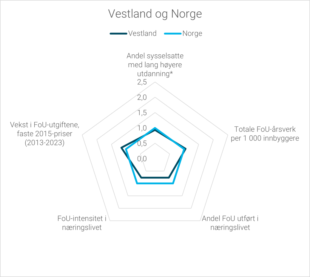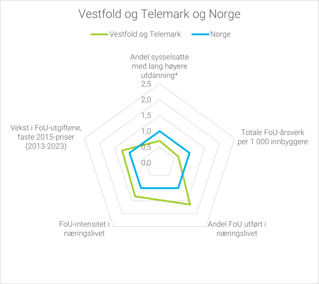 I Oslo er fortsatt næringslivets andel av FoU-aktiviteten høyest, men her utgjør også universitets- og høgskolesektorens andel en stor del av FoU-aktiviteten i fylket. I både Vestland og Trøndelag er universitets- og høgskolesektoren den største bidragsyteren til fylkenes FoU-aktivitet. Troms og Finnmark er det eneste fylket hvor universitets- og høgskolesektoren har høyest andel av FoU-aktiviteten.