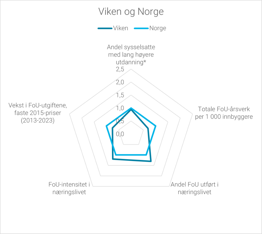 Viken er fylket med nest høyest FoU-aktivitet, med 17 prosent av de totale FoU-utgiftene. Deretter følger Trøndelag med 16 prosent og Vestland med 12 prosent. Det er i disse fylkene vi finner de fleste av store utdanningsinstitusjonene og de største universitetssykehusene, flere store forskningskonsern og forskningsinstitutter og det største omfanget av FoU-intensivt næringsliv.