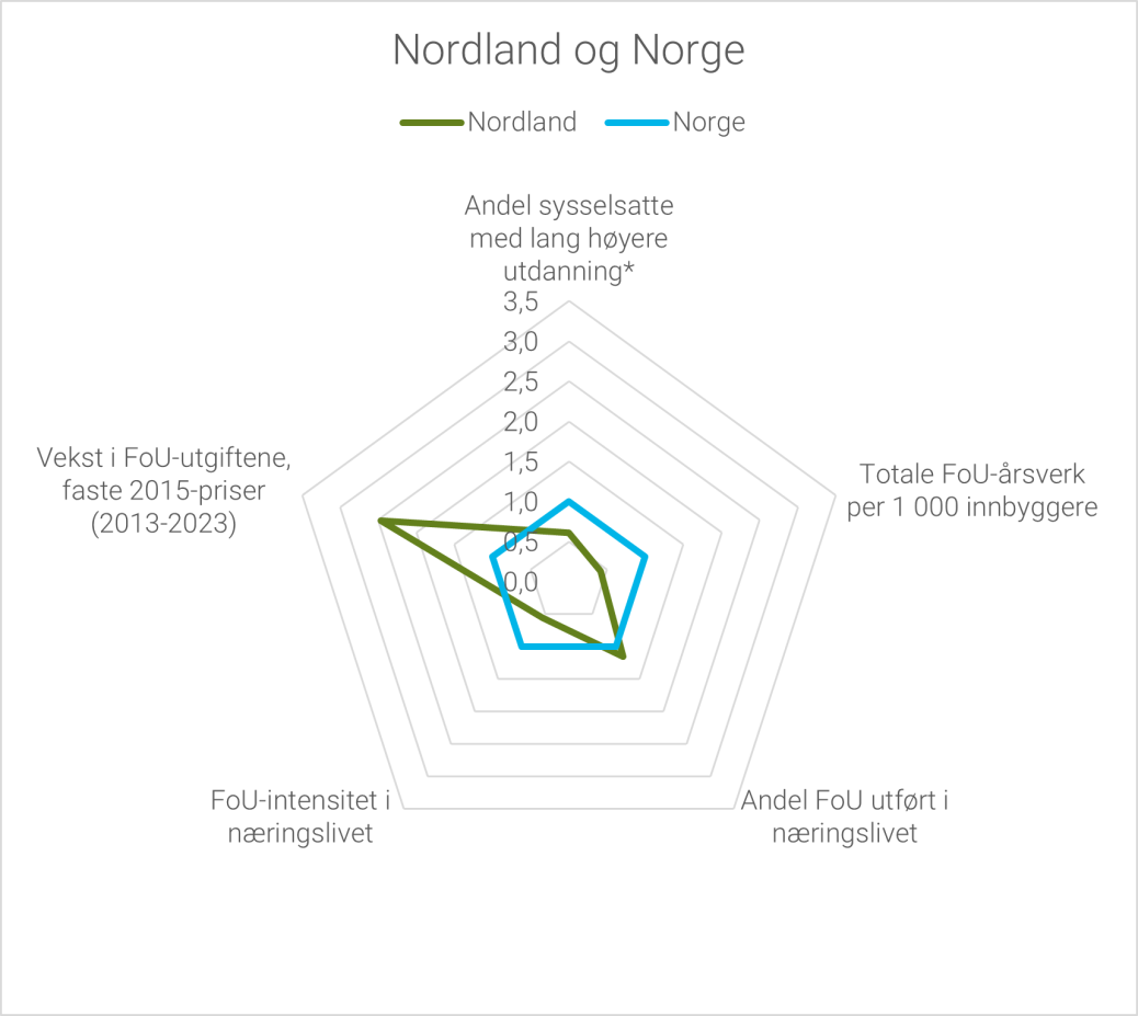 Selv om Troms og Finnmark ligger et stykke bak de 4 største fylkene målt i totale FoU-utgifter har vårt nordligste fylke en høy andel FoU-utgifter per innbygger. Her har lokaliseringen av UiT – Norges arktiske universitet og Universitetssykehuset i Nord-Norge stor betydning for den høye andelen.