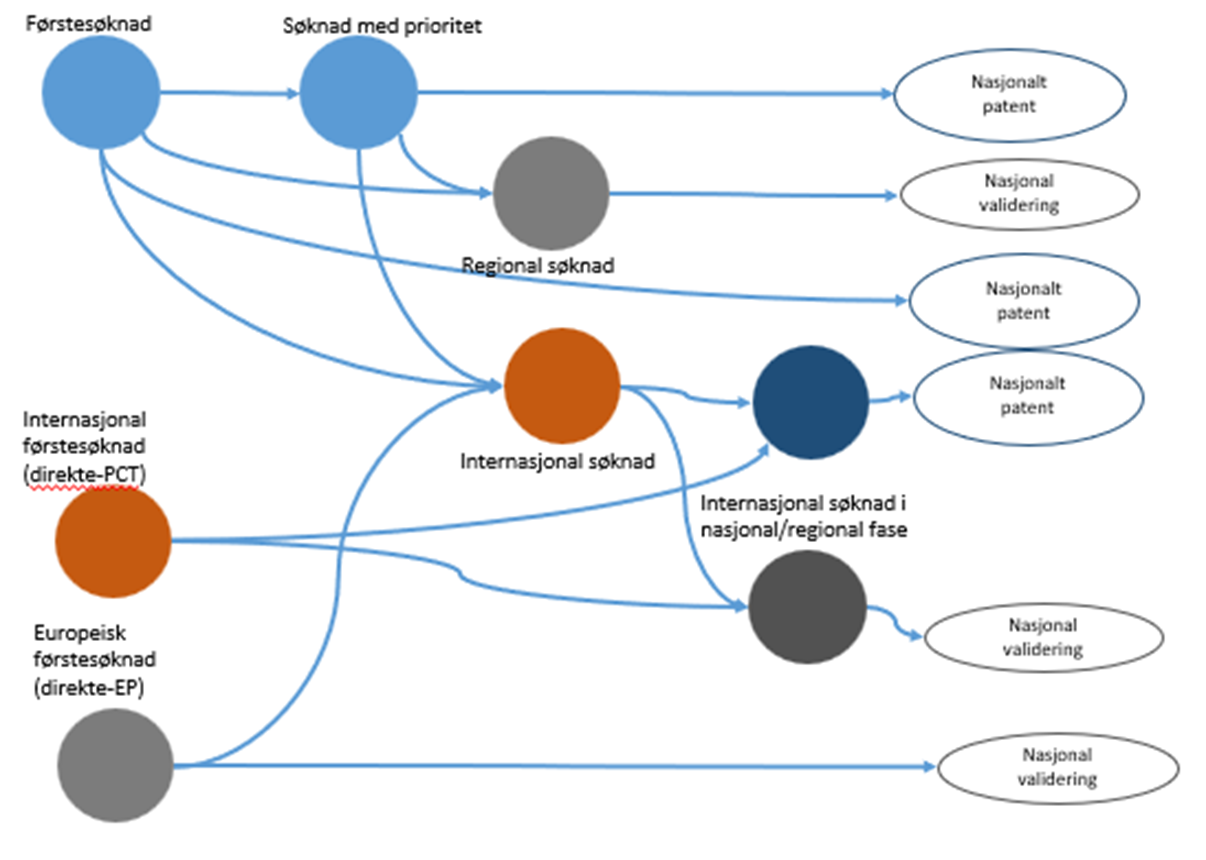 Figuren nedenfor viser hovedveiene inn til det norske patentsystemet. Søknaden kan leveres som nasjonal førstesøknad, eller den kan komme via internasjonale (PCT) eller regionale (EP[3]) faser, og senere fases inn i Norge.