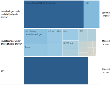 Figur 2 viser bidragene fra de forskjellige porteføljestyrene og EU som inngår i portefølje for energi, transport og lavutslipp. Figuren viser at porteføljestyrets egne investeringer står for om lag 36 prosent av porteføljen. De største bidragene fra andre sine investeringer kommer fra den komplementære arenaen for næringslivsstyrt forskning, generelle bevilgninger til relevant forskningsinfrastruktur og grunnbevilgninger, samt bevilgninger som er målrettet mot porteføljene for klima-, miljø-, maritim-, material- og petroleumsforskning, men som samtidig treffer energi, transport og lavutslippsporteføljen tematisk.