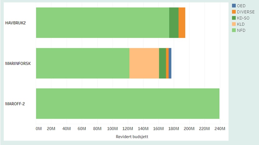 Den største andelen av finansiering til den målrettede marine satsningen (MARINFORSK) kommer fra Nærings- og fiskeridepartementet, etterfulgt av Klima- og miljødepartementet og dernest Kunnskapsdepartementet. Havbruksforskningen (HAVBRUK) finansieres av hovedsakelig av Nærings- og fiskeridepartementet, men Kunnskapsdepartementet bidrar også med midler fra sektorovergripende del[15]. Det maritime (MAROFF) finansieres hovedsakelig av Nærings- og fiskeridepartementet, men fra 2022 får det også midler fra Klima- og miljødepartementet. Den tverrgående satsingen på havteknologi finansieres av Nærings- og fiskeridepartementet.