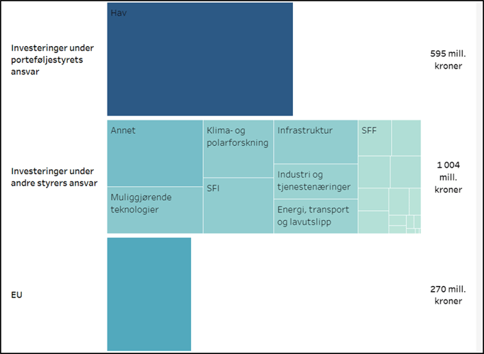 Figur 2 viser bidragene fra de forskjellige porteføljestyrene i Forskningsrådet og EU som inngikk i Hav-porteføljen i 2021. Figuren viser at av Forskningsrådets midler så utgjør porteføljestyret for Hav sin egen investering om lag 37% av porteføljen. De største bidragene fra andre i porteføljer Forskningsrådet kommer fra porteføljene for Muliggjørende teknologier (ca. 8%), Klima- og polarforskning (7%), og Industri og tjenestenæring og Energi, transport og lavutslipp som begge bidrar med ca. 5% hver inn i porteføljen for Hav. I tillegg er det store bidrag fra SFI (7%) og Infrastruktur (ca.6,5%).