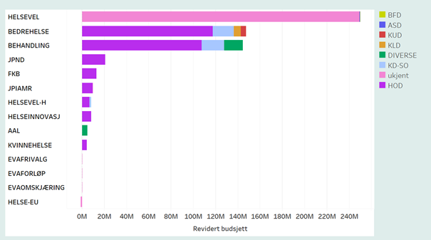 Porteføljestyret for helse forvalter tre store budsjettformål som skal bidra til forskning og innovasjon innenfor forebygging og folkehelse (BEDREHELSE), behandling, diagnostikk og rehabilitering (BEHANDLING) og helse-, omsorgs- og velferdstjenester (HELSEVEL). I tillegg forvalter porteføljestyret midler til senterordningen Forskningssentre for klinisk behandling (FKB), satsingen på kvinners helse og helse i et kjønnsperspektiv (KVINNEHELSE) og helseinnovasjon (HELSEINNOVASJON) og til deltakelse i EU-partnerskap. Disse målrettede aktivitetene finansieres primært av Helse- og omsorgsdepartementet (HOD), men det er også bidrag fra Kunnskapsdepartementet (KD), Arbeids- og inkluderingsdepartementet (AID), Barne- og familiedepartementet (BFD), Klima- og miljødepartementet (KLD), Kultur og likestillingsdepartementet (KUD) og Nærings- og fiskeridepartementet (NFD). Porteføljeplanen ivaretar departementenes sektorielle og sektorovergripende styringssignaler. Andre budsjettformål som bidrar betydelig til helseporteføljen og forvaltes av andre porteføljestyrer er: