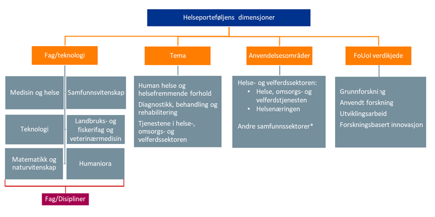 Den norske FoU-statistikken deler forskningen inn i seks overordnede fagområder, som igjen er brutt ned i fag og deretter disipliner. Helseporteføljen inkluderer hele fagområdet medisin og helsefag. Mange fag og disipliner under andre fagområder inngår også i helseprosjektene. Det gjelder særlig fagområdet teknologi, men også naturvitenskap og matematikk, samfunnsvitenskap og humaniora.