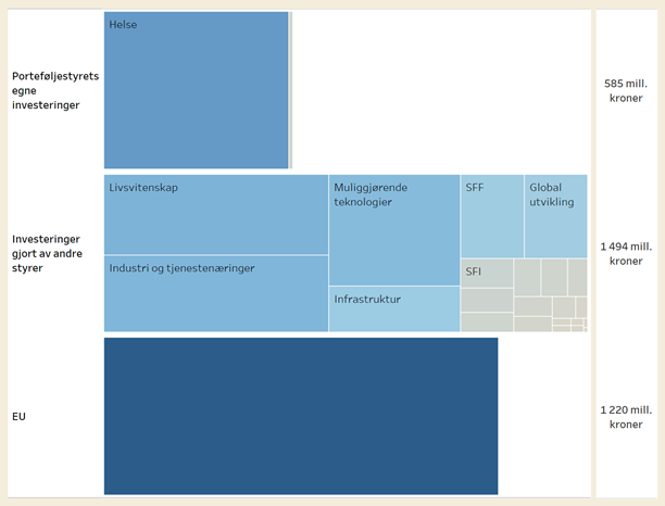 Figur 3 viser bidragene fra de forskjellige porteføljestyrene og EU som inngår i helseporteføljen. Figuren viser at porteføljestyret for helses egne investeringen står for om lag 18 prosent av helseporteføljen.