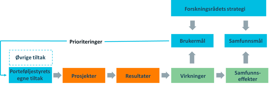 Investeringsmålene er forankret i Forskningsrådets strategi og består av samfunnsmål og brukermål[1]. De tiltak som settes i gang av Forskningsrådet skal resultere i noen forventede virkninger og samfunnseffekter i henhold til en investeringslogikk (se figur 1). Se vedlegg for en oversiktlig fremstilling av denne porteføljens investeringslogikk.