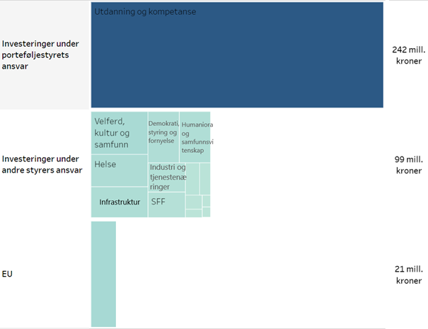 Figur 2 viser bidragene fra de forskjellige porteføljestyrene og EU som inngår i porteføljen for Utdanning og kompetanse. Figuren viser at porteføljestyret for Utdanning og kompetanse egne investeringer står for 65% av porteføljen. De største bidragene fra andre sine investeringer kommer fra porteføljene for Velferd, kultur og samfunn, Helse, Humaniora og samfunnsvitenskap og ordningen for Offentlig sektor-ph.d.