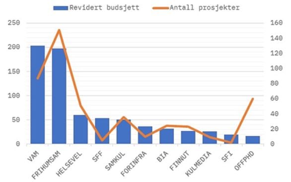 Forskningsrådets totalportefølje i 2022 var 12,1 mrd. kroner. Samme år var Forskningsrådets samlede innsats på porteføljeområdet 875 mill. kroner (648 prosjekter). Årlig utgjør Forskningsrådets midler omtrent 30 % av de nasjonale forskningsmidlene til velferds-, arbeids- kultur- og medieforskning.