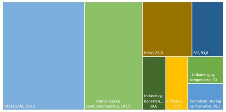 Utover porteføljestyrets egen innsats kommer det klart største bidraget fra porteføljen for Humaniora og samfunnsvitenskap. I 2022 bidro Humaniora og samfunnsvitenskap med 197 mill. kr til forskning på Velferd, kultur og samfunn sine områder. Det store bidraget er en naturlig konsekvens av at porteføljestyret her lyser ut store, tematisk frie midler gjennom budsjettformålet FRIHUMSAM, som går til bl.a. velferds-, arbeids- og kulturforskning. Tredje størst er Helse-porteføljen, primært ved budsjettformålet Gode og effektive helse- omsorgs- og velferdstjenester (HELSEVEL). Porteføljestyret for Helse investerte i underkant av 86 mill. kr på porteføljens områder i 2022. Porteføljestyrene for Velferd, kultur og samfunn og Helse har overlappende ansvar for bl.a. arbeids- og velferdstjenestene og tjenester for barn, unge og familier. Andre bidragende porteføljer inkluderer Industri og tjenestenæringer, Demokrati, styring og fornyelse og Utdanning og kompetanse. Overlappende innsats inkluderer forskning om bl.a. tillit, levekår, integrering og inkludering, samt digitalisering. Det er også betydelige bidrag fra ordningene for Senter for fremragende forskning (SFF) og Infrastruktur. Figuren under viser hvilke budsjettformål som er de største bidragsyterne til porteføljens ansvarsområder i 2022.
