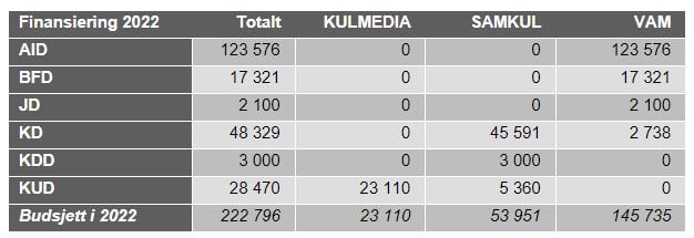 Porteføljestyrets egne investeringer forvaltes gjennom budsjettformålene Velferd, arbeidsliv og migrasjon (VAM), Samfunnsutviklingens kulturelle forutsetninger (SAMKUL) og Kultur- og mediesektoren (KULMEDIA). Budsjettformålene finansieres av Arbeids- og inkluderingsdepartementet (AID), Barne- og familiedepartementet (BFD), Justisdepartementet (JD), Kunnskapsdepartementet (KD), Kommunal- og distriktsdepartementet (KDD) og Kulturdepartementet (KD). Tabellen under viser hvordan departementenes tildelinger fordelte seg i 2022 (i mill. kr).