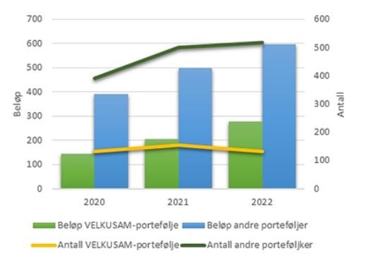 I 2022 investerte porteføljestyrets budsjettformål ca. 279 mill. kr fordelt på 132 pågående prosjekter. Fra 2021 er det en nedgang fra 154 pågående prosjekter, men en budsjettmessig økning på 36 %. Dette kan trolig forklares med overgang mellom programperioder for VAM i 2018 – et større antall eldre prosjekter har blitt avsluttet og nye prosjekter har økende aktivitet som det blir utbetalt midler til. Diagrammet under viser utviklingen på porteføljestyrets ansvarsområder i investeringer og antall prosjekter i perioden 2020-2022 - for egen innsats og andre porteføljestyrer sin innsats.